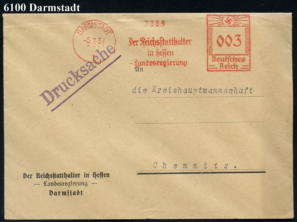 1143 | 20 € | 6100 Darmstadt Absender-Freistempel : DARMSTADT/ 1/ Der Reichsstatthalter/ in Hessen/ Landesregierung 1937 (5.7.) AFS Francotyp "Hakenkreuz" auf Dienst-Fern-Bf. = Machthaber nach Gleichschaltung der Länder nach d. 2. Gleichschaltungs-Gesetz vo, 7.4.1933 (Dü.E-3BAh) | ![]() | |