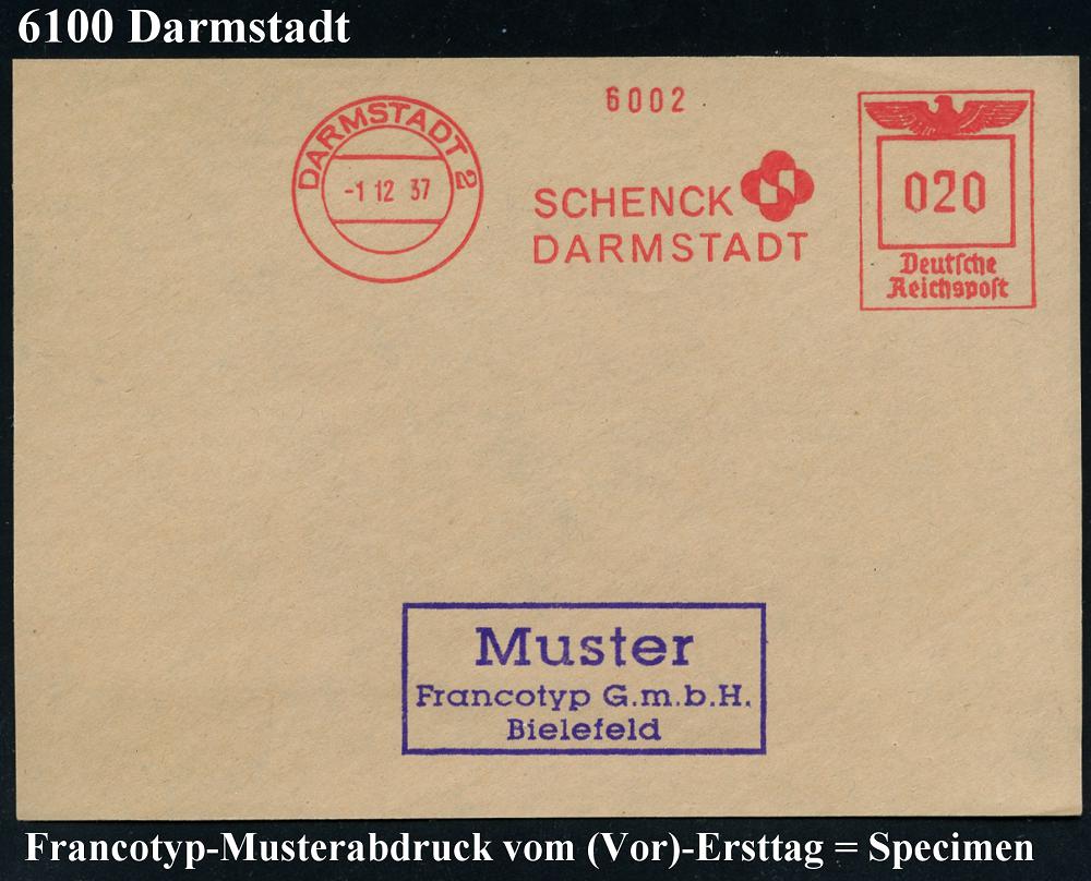 1144 | 35 € | 6100 Darmstadt Absender-Freistempel : DARMSTADT 2/ SCHENCK.. 1937 (1.12.) AFS-Musterabdruck Francotyp "Reichsadler" (Firmen-Logo) glasklar gest. Francotyp-Musterblatt vom (Vor)-Ersttag!, selten! (Dü.E-5CGh) | ![]() ![]() | |