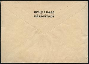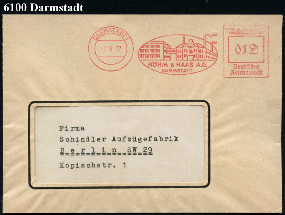 1145 | 20 € | 6100 Darmstadt Absender-Freistempel : DARMSTADT 1/ RÖHM & HAAS AG.. 1937 (7.12.) AFS Francotyp "Reichsadler" (Fabrik-Anlage) rs. Abs.-Vordruck: RÖHM & HAAS AG, CHEMISCHE FABRIK.., Fern-Bf., vergl. Nr.1141 (Dü.E-5CEo) | ![]() ![]() | |
