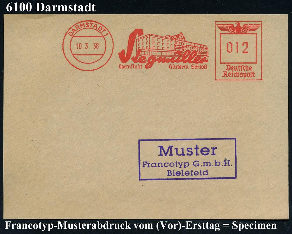 1146 | 35 € | 6100 Darmstadt Absender-Freistempel : DARMSTADT 1/ Stegmüller/ ..hinterm Schloß 1938 (10.3.) AFS-Musterabdruck Francotyp "Reichsadler" (Gebäude) glasklar gest. Francotyp-Musterblatt vom (Vor)-Ersttagsblatt, selten! (Dü.E-5CGo) | ![]() ![]() | |