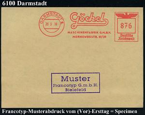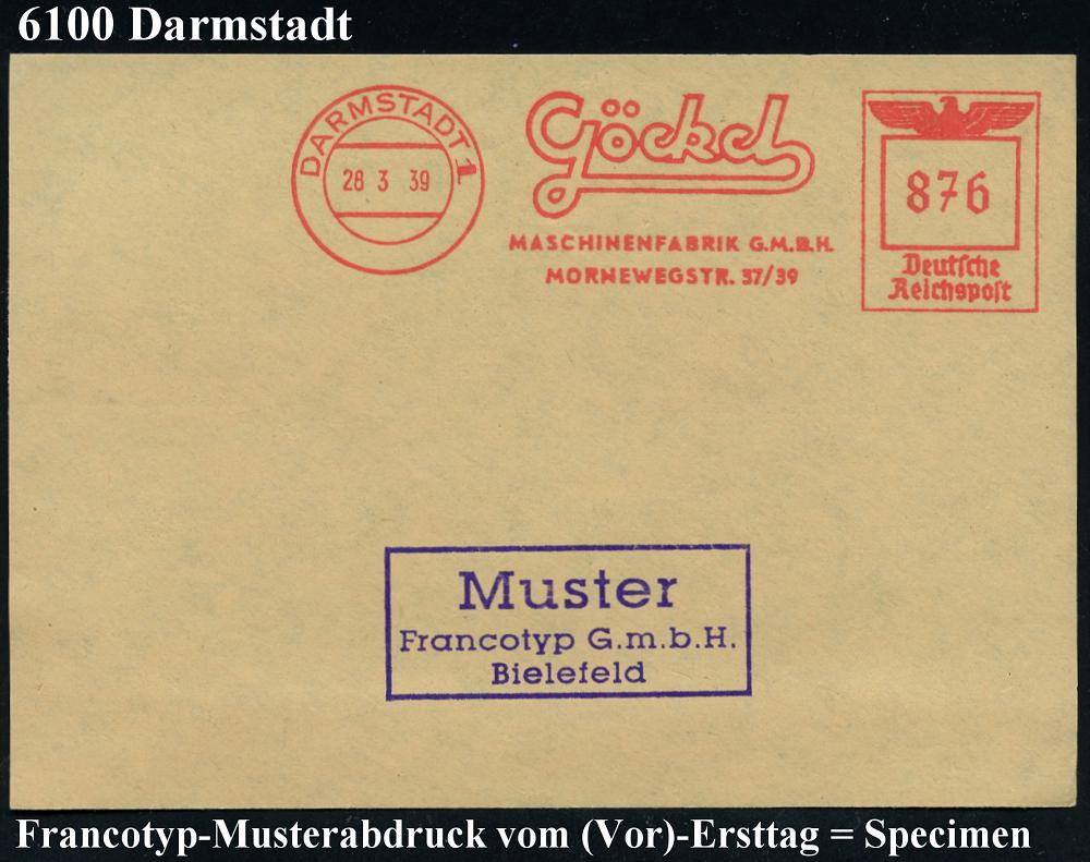 1149 | 35 € | 6100 Darmstadt Absender-Freistempel : DARMSTADT 2/ Göckel/ MASCHINENFABRIK GMBH.. 1939 (28.3.) AFS-Musterabdruck glasklar auf Francotyp-Musterblatt vom (Vor)-Ersttag!, selten! (Dü.E-5CGo) | ![]() ![]() | |