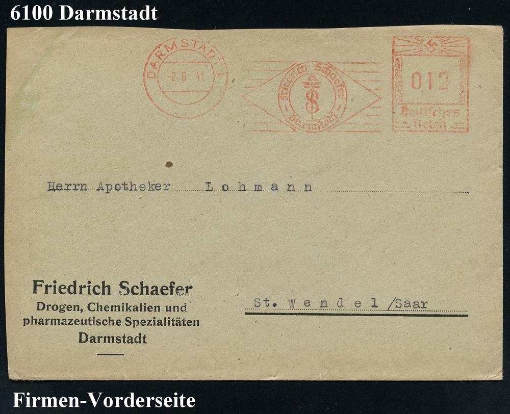 1150 | 15 € | 6100 Darmstadt Absender-Freistempel : DARMSTADT 1/ Friedrich Schaefer.. 1941 (2.8.) AFS Francotyp "Hakenkreuz" (Firmen-Monogr.-Logo) Firmen-Vorderseite: Friedrich Schaefer: Drogen, Chemikalien.. (Dü.E-3CGo) | ![]() | |