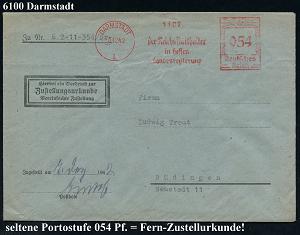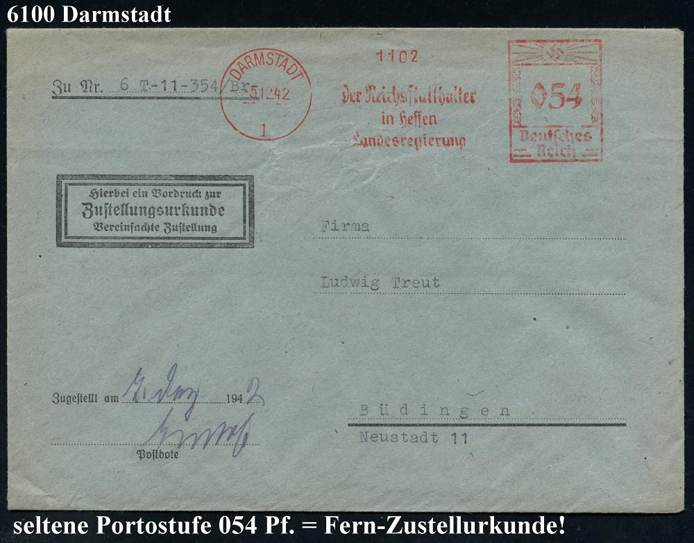 1153 | 25 € | 6100 Darmstadt Absender-Freistempel : DARMSTADT/ Der Reichsstatthalter/ in Hessen/ Landesregierung 1942 (5.12.) AFS Francotyp "Hakenkreuz" 054 Pf. auf Fern-Zustellungsurkunde (ZU), seltenes Porto (Dü.E-3BAh) | ![]() | |