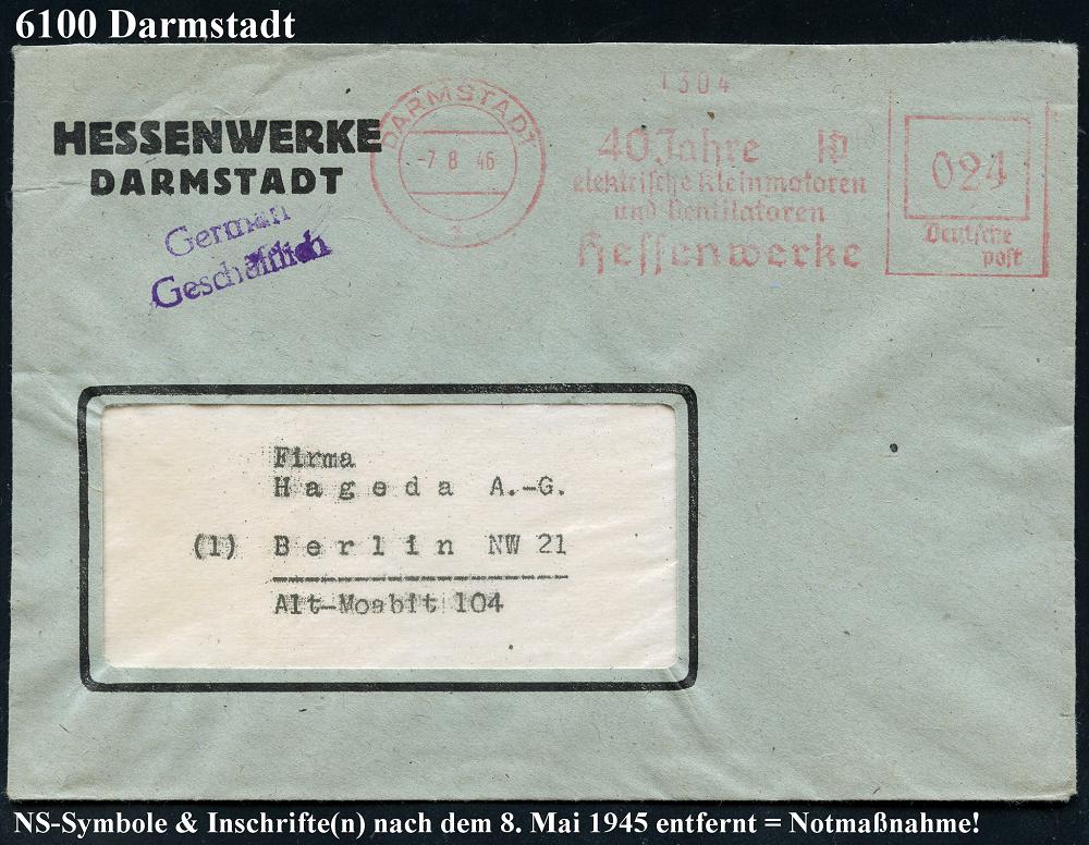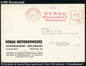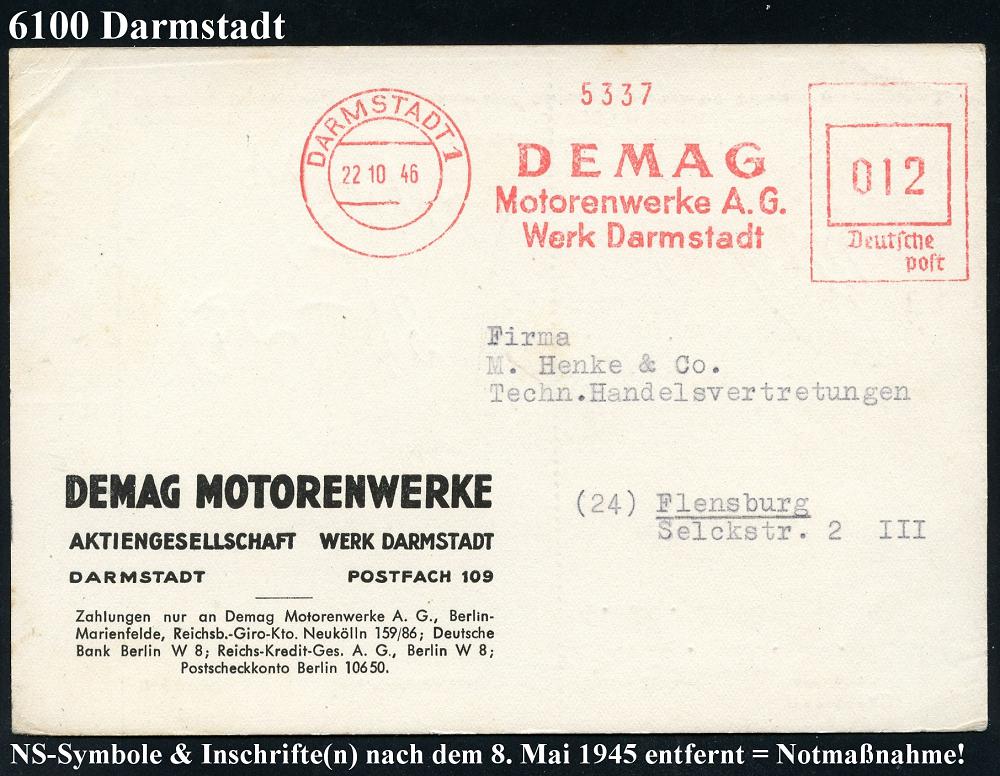 1154 | 30 € | 6100 Darmstadt Absender-Freistempel : DARMSTADT 1/ DEMAG/ Motorenwerke AG/ Werk Darmstadt 1942/46 AFS Francotyp "Reichsadler" von 1942 auf Teil-Vorderseite und aptiert = "Reichsadler" + Inschrift "Reichs" entfernt von 1946 als Notmaßnahme auf Firmen-Kt. , 2 Belege in Entwicklungs-Darstellung, 2 Belege (Dü.E-5CGh, E-13 Y-1929h) | ![]() ![]() | |