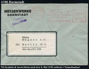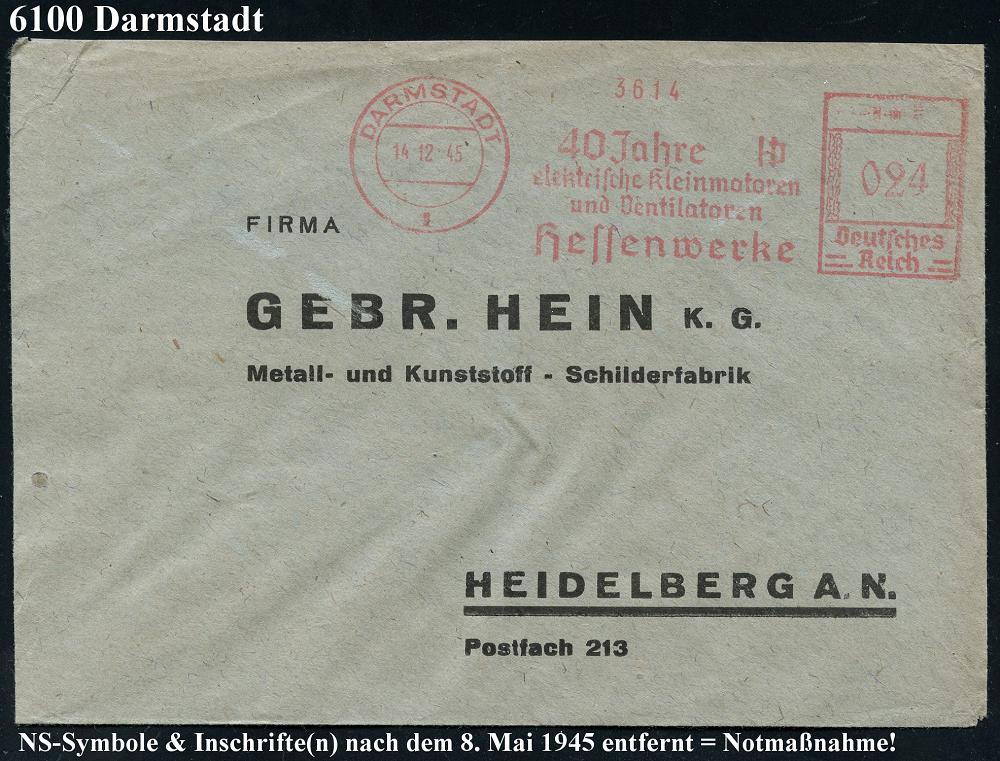 1155 | 30 € | 6100 Darmstadt Absender-Freistempel : DARMSTADT/ 1/ 40 Jahre/ elektr.Kleinmotoren/ u.Ventilatoren/ Hessenwerke 1945 (14.12.) aptierter AFS Francotyp "Hakenkreuz" = entfernt = Notmaßnahme! , seltener Fern-Bf. n. Heidelberg (E-12 K-97h) | ![]() | |