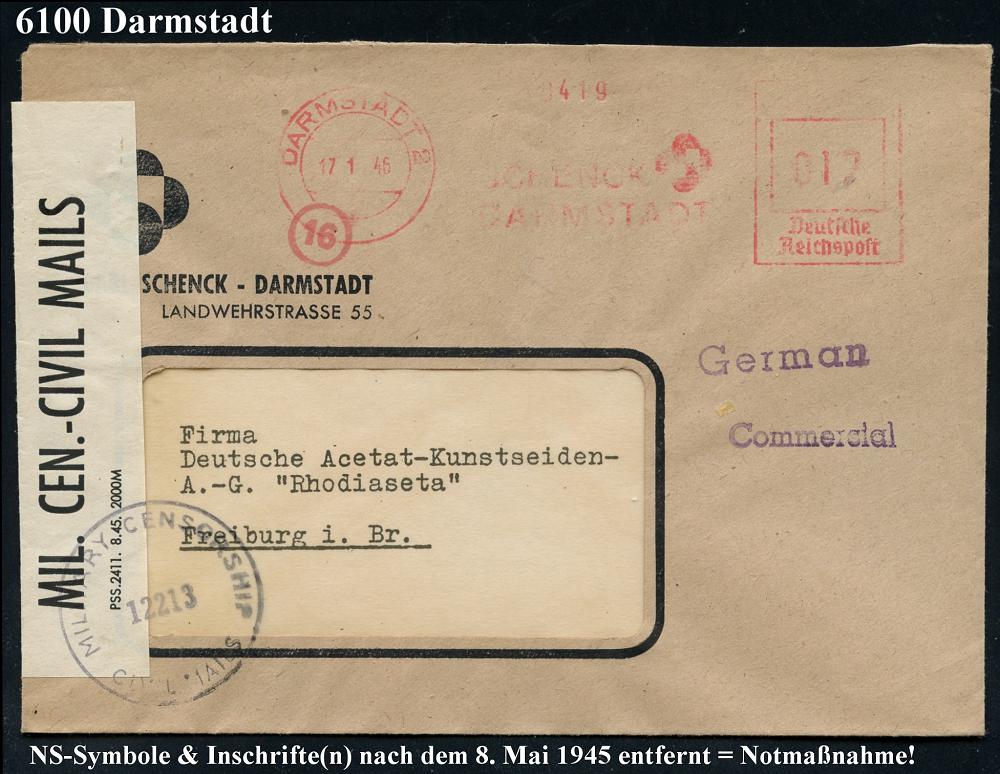 1156 | 28 € | 6100 Darmstadt Absender-Freistempel : DARMSTADT 2/ SCHENCK.. 1946 (17.1.) aptierter AFS Francotyp "Reichsadler" = entfernt = Notmaßnahme! + US-Zensurstreifen: OPENED BY/MIL. CEN.-CIVIL MAILS/PSS.2411 + viol. Zensur-1K: MILITARY CENSORSHIP/12213/CIVIL MAILS = Offenbach (Rie. A-100 + 50 Pkte., A-1) Fern-Zensur-Bf., vergl. Nr.1144, 1158 (Dü.E-13 J-129h) | ![]() ![]() | |