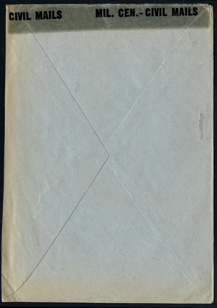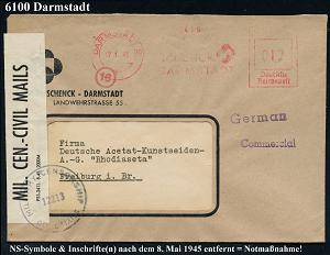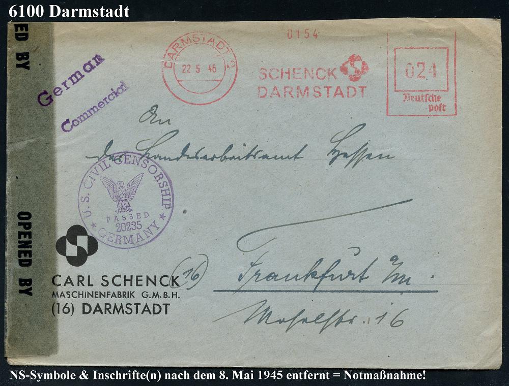 1157 | 30 € | 6100 Darmstadt Absender-Freistempel : DARMSTADT 2/ SCHENCK.. 1946 (22.5.) aptierter AFS Francotyp "RReichsadler" = entfernt + "Reichs" = Notmaßnahme! + US-Zensurstreifen: OPENED BY/ MIL. CEN.-CIVIL MAILS + viol. 1K: U.S. CIVIL CENSORSHIP/PASSED/20235/GERMANY (= Offenbach, Rie.A-2 + 50 Pkte., A-102), vergl. Nr. 1144 u. 1156 (Dü.E-13 Y-129h) | ![]() ![]() | |