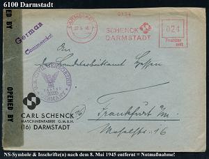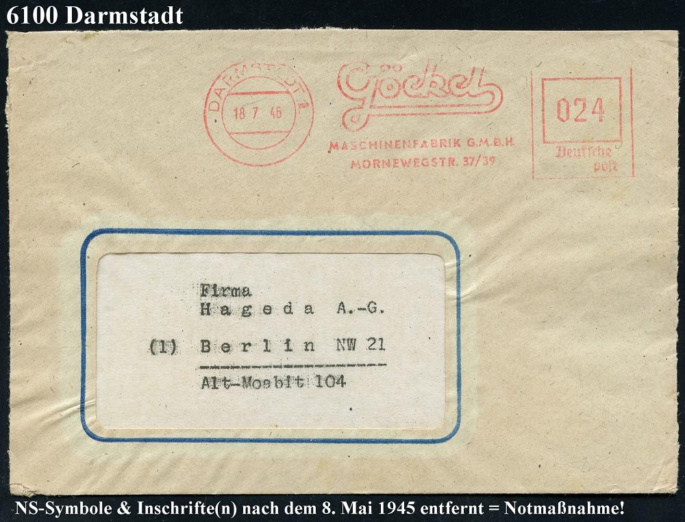 1160 | 22 € | 6100 Darmstadt Absender-Freistempel : DARMSTADT 1/ Göckel/ MASCHINENFABRIK GMBH.. 1946 (18.7.) aptierter AFS Francotyp "Reichsadler" = entfernt + "Reichs" = Notmaßnahme! , rs. Abs.-Vordruck: GUSTAV GÖCKEL, Maschinenfabrik.., vergl Nr.1149 (Dü.E-13 Y-129o) | ![]() ![]() | |