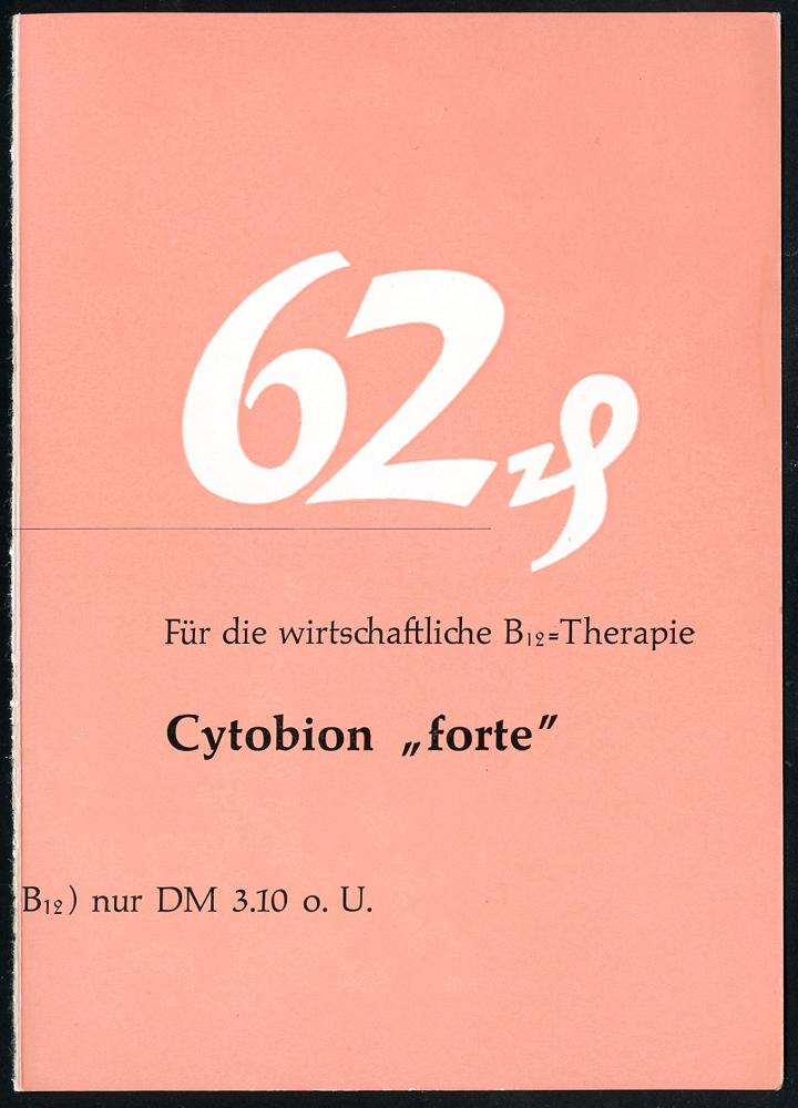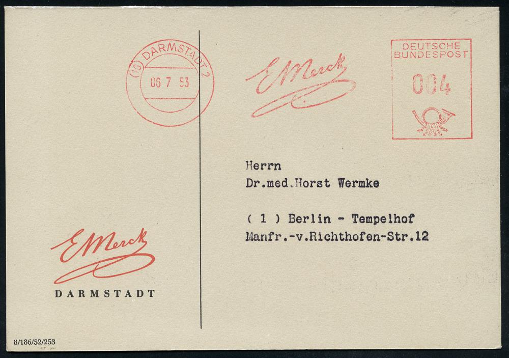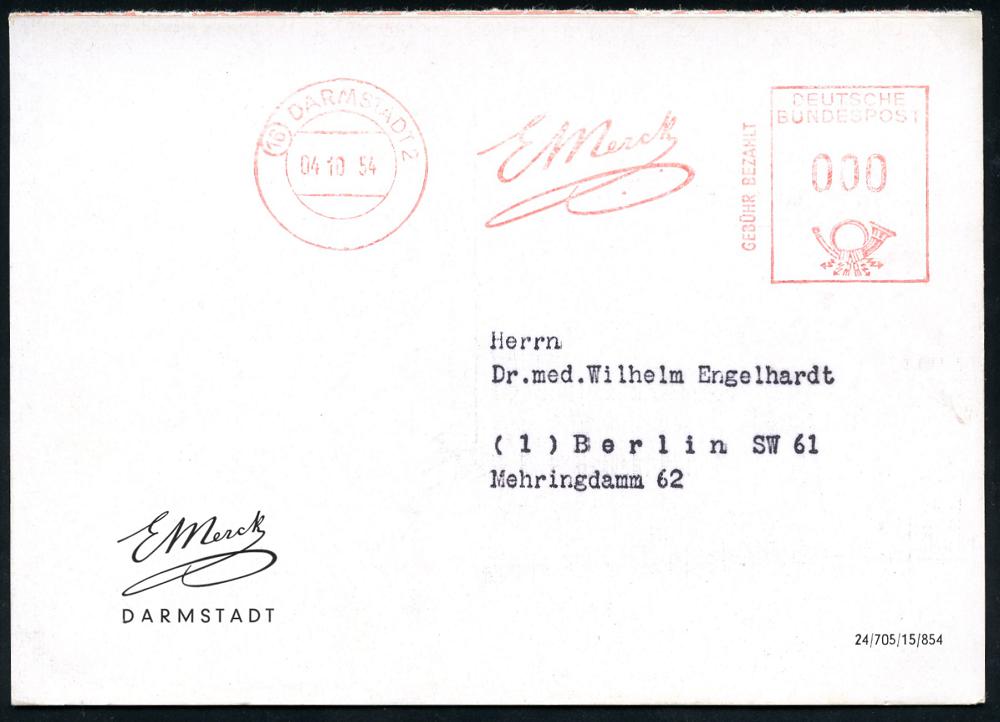 1167 | 15 € | 6100 Darmstadt Absender-Freistempel : (16) DARMSTADT 2/ E Merck/ GEBÜHR BEZAHLT 1954 (4.10.) AFS Francotyp "Posthorn" IN = Massen-Drs. auf (halber) zweifarbiger (halber) Reklame-Kt.: Cytobion "forte" ("62 Pf.") Fern-Kt. (Dü.E-23CO) | ![]() ![]() | |