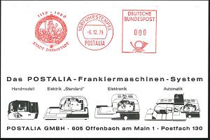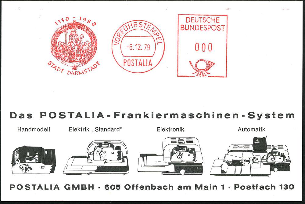1173 | 18 € | 6100 Darmstadt Absender-Freistempel : Darmstadt 1979 (6.12.) AFS: VORFÜHRSTEMPEL/POSTALIA/1330 - 1980/STADT DARMSTADT (Siegel: Ludwig mit Reichsapfel) seltene Postalia-Musterkt.! (= Specimen) | ![]() | |