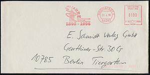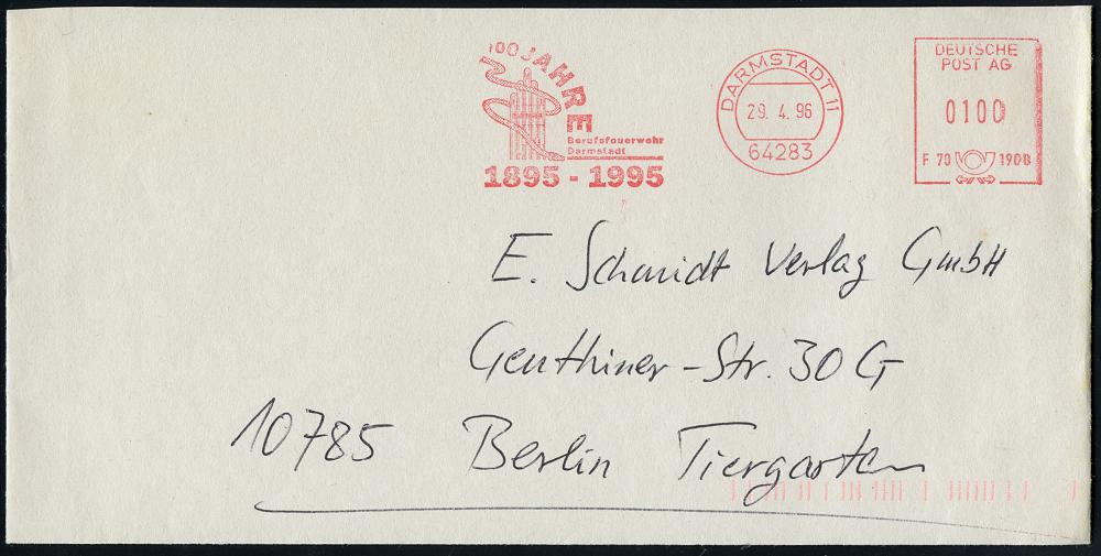 1176 | 12 € | 6100 Darmstadt Absender-Freistempel : 64283 DARMSTADT 11/ F70 1900/ 100 JAHRE/ Berufsfeuerwehr/ Darmstadt/ 1895-1995 1996 (29.4.) AFS Postalia "DEUTSCHE POST AG" (Hochzeits-Turm mnit Feuerwehrschlauch) Kommunal-Bf. | ![]() | |