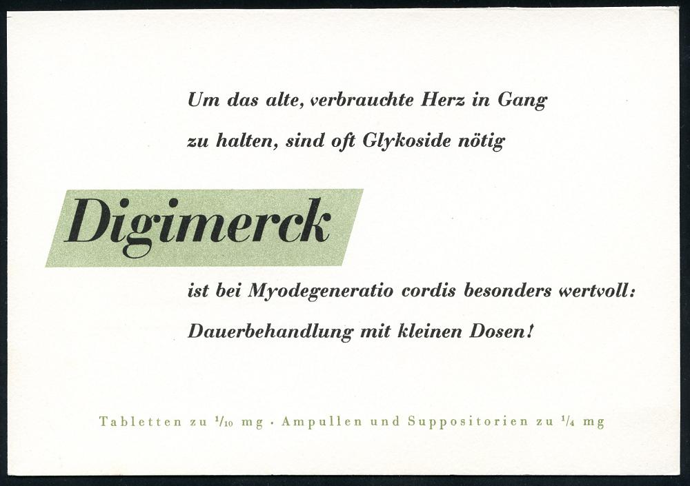 1165 | 15 € | 6100 Darmstadt Absender-Freistempel : (16) DARMSTADT 2/ E Merck 1953 (6.7.) AFS Francotyp "Posthorn" (Schriftzug) auf motivgl. Reklame-Kt.: Digimerck.. Herzmittel , Fern-Kt. (Dü.E-23CO) | ![]() ![]() | |