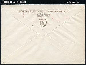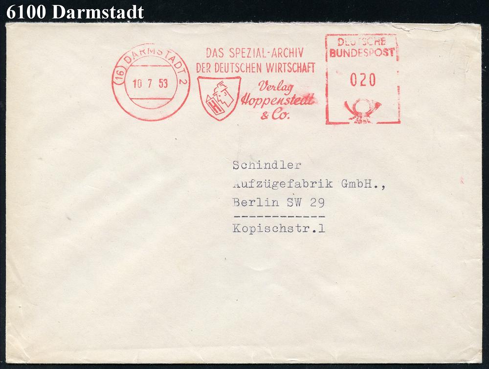 1166 | 10 € | 6100 Darmstadt Absender-Freistempel : (16) DARMSTADT 2/ DAS SPEZIAL-ARCHIV/ DER DEUTSCHEN WIRTSCHAFT/ Verlag/ Hoppenstedt.. 1953 (10.7.) AFS Postalia (Merkurkopf) rs. motivgl. Abs.-Vordruck, Fern-Bf. (Dü.E-23 B) | ![]() ![]() | |