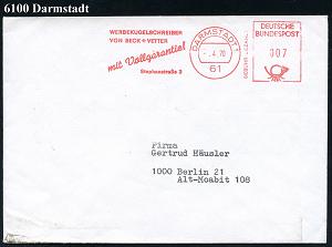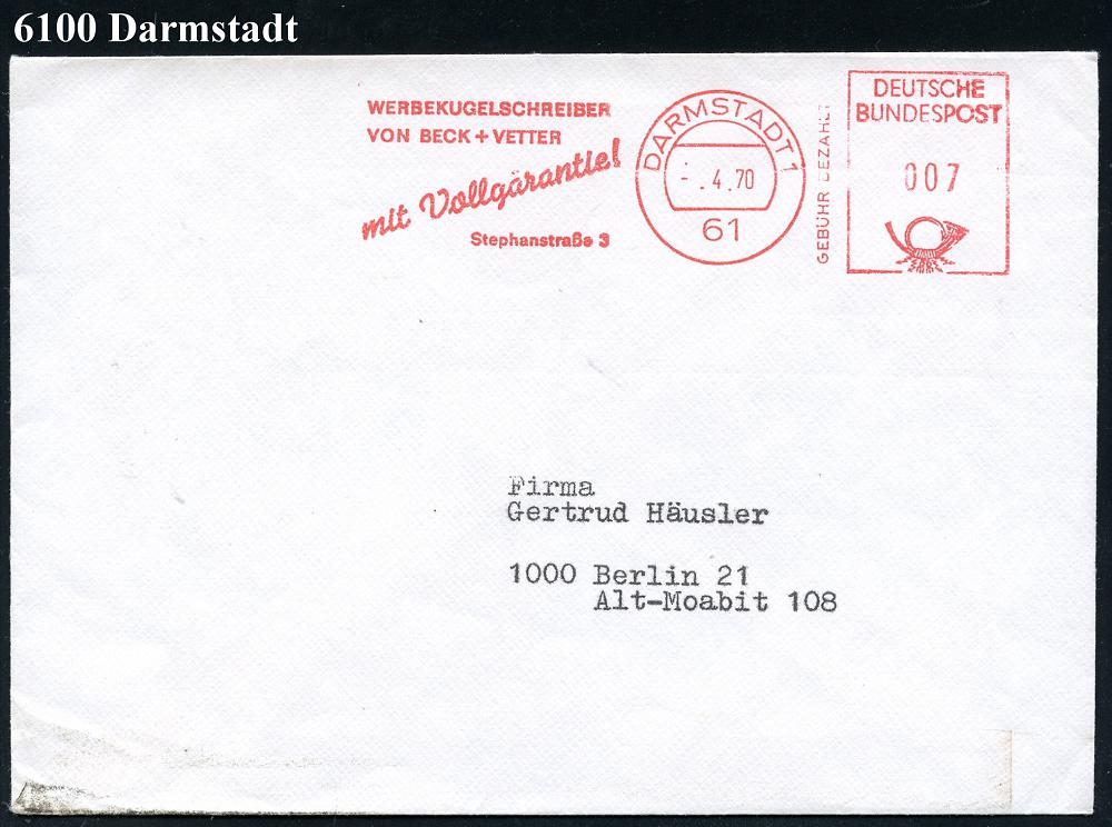 1172 | 6 € | 6100 Darmstadt Absender-Freistempel : 61 DARMSTADT 1/ GEBÜHR BEZAHLT/ WERBEKUGELSCHREIBER/ VON BECK + VETTER.. 1970 (Apr.) AFS Postalia 007 Pf. = Massen-Drs. (m i t Wertangabe) Fern-Bf. (Dü.E-26B) | ![]() | |