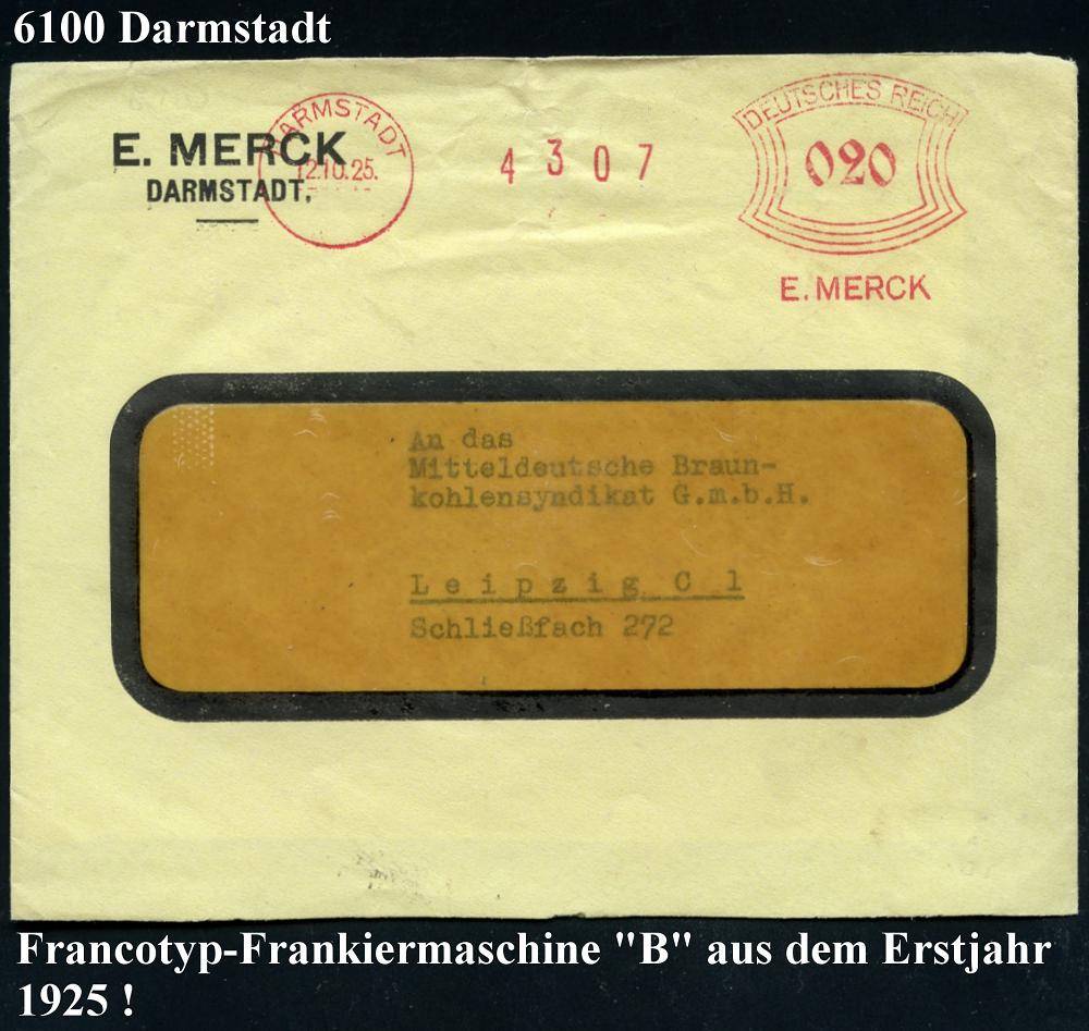 1132 | 35 € | 6100 Darmstadt Absender-Freistempel : DARMSTADT/ E.MERCK 1925 (12.10.) sehr früher AFS Francotyp "Bogenrechteck" klar auf Firmen-Bf.: E. MERCK.., rs. dekorativer. Abs.-Vordruck (Dü.E-1BAm, gr.Zählnr., Erstjahr!) | ![]() ![]() | |