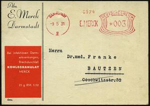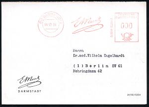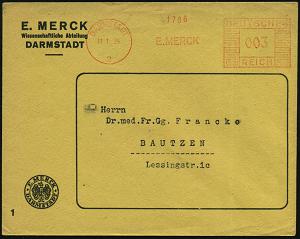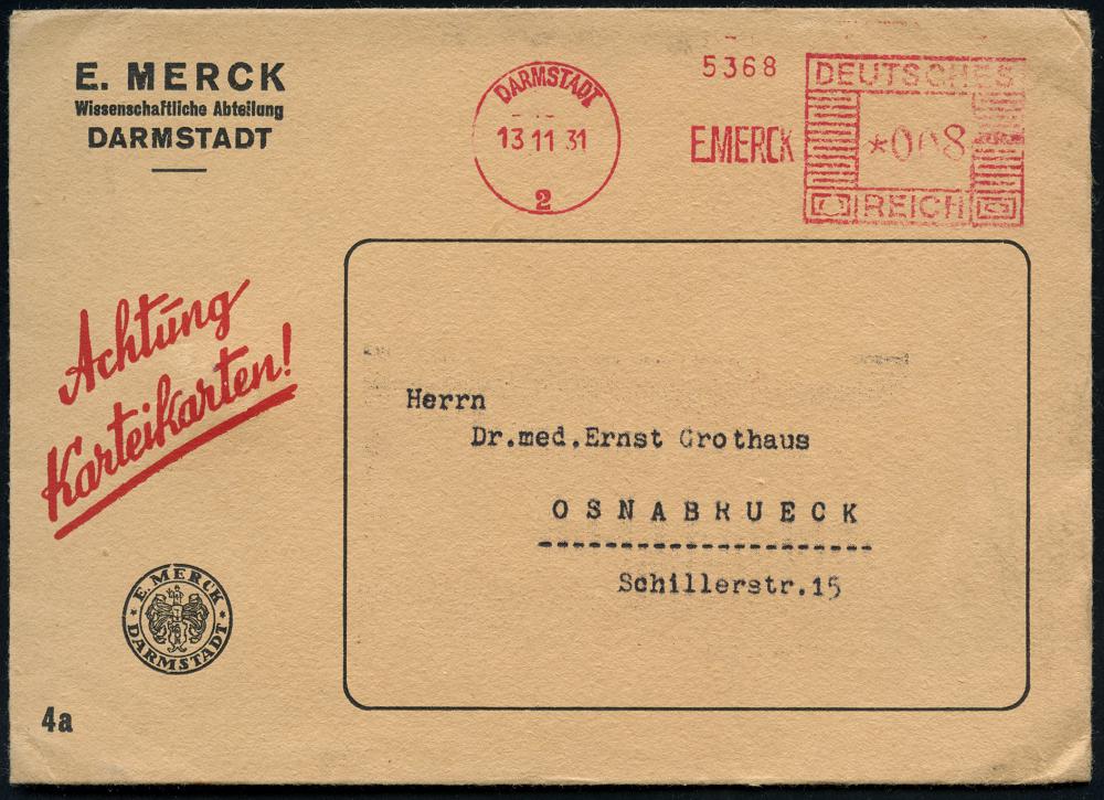 1136 | 20 € | 6100 Darmstadt Absender-Freistempel : DARMSTADT/ 2/ E.MERCK 1931 (13.11.) AFS Francotyp "Mäanderrechteck" 008 Pf. auf dekorativem, zweifarbigem Firmen-Bf. mit Firmenwappen: "Achtung Karteikarte" (Dü.E-2Ah) | ![]() | |