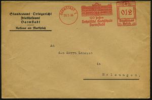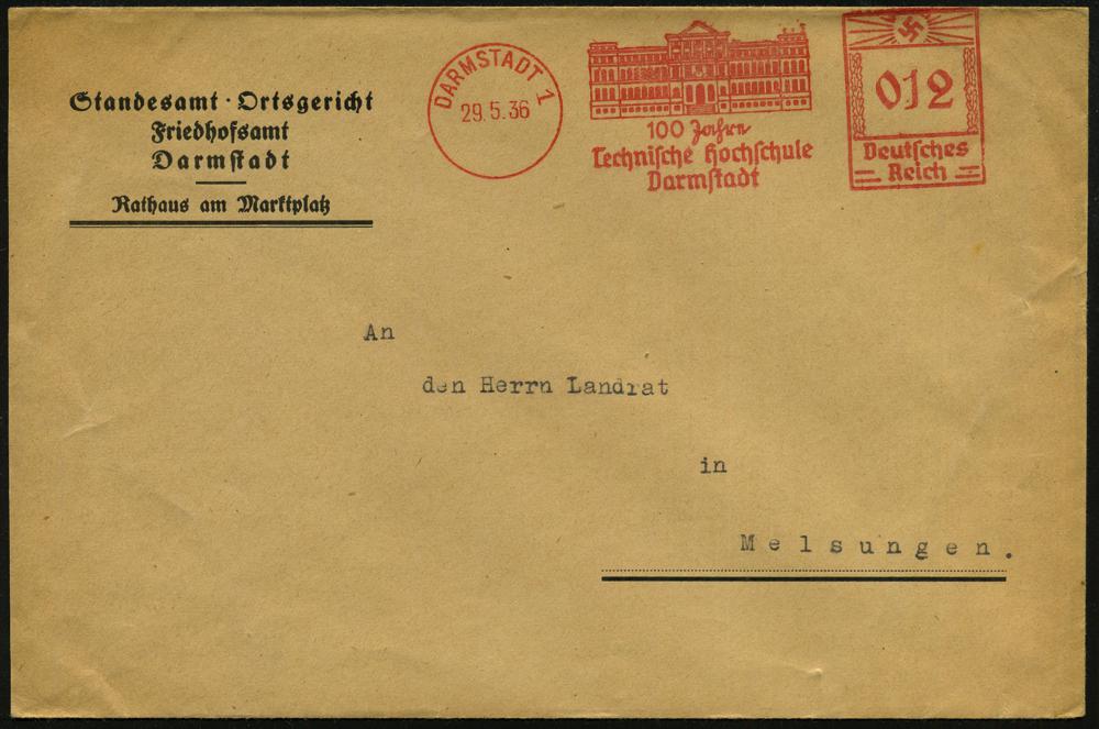 1139 | 25 € | 6100 Darmstadt Absender-Freistempel : DARMSTADT 1/ 100 Jahre/ Technische Hochschule 1936 (29.5.) seltener Jubil.-AFS (= Hochschulgebäude) kommunaler Dienst-Bf.: Standesamt-Ortsgericht Friedhofsamt..Rathaus am Marktplatz, klar gest. Fernbf. (Dü.E-3BA) | ![]() | |