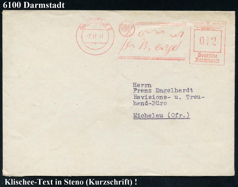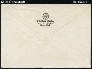 1151 | 25 € | 6100 Darmstadt Absender-Freistempel : DARMSTADT 2/ WINKLERS VERLAG/ (Gebr.Grimm) 1941 (7.11.) sehr seltener AFS Francotyp "Reichsadler": Werbeklischee vollständig in S t e n o (+ Logo)im Ort gering undeutl.. rs. Abs.-Vordruck: Winklers Verlag (Gebr. Grimm) Darmstadt (Logo) Fern-Bf. (Dü.E-5CG) | ![]() ![]() | |