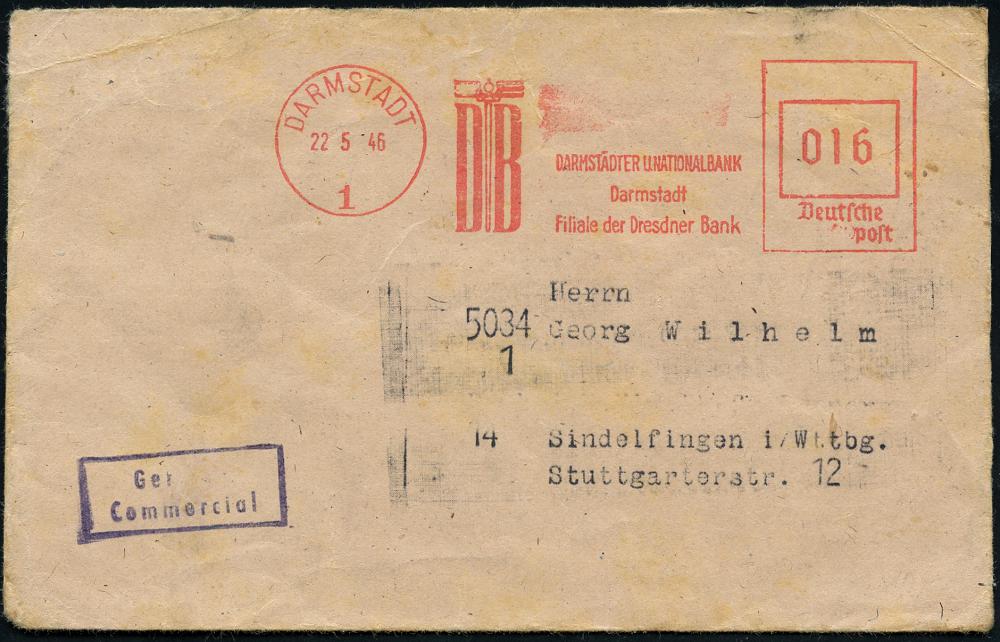 1159 | 22 € | 6100 Darmstadt Absender-Freistempel : DARMSTADT/ 1/ DB/ DARMSTÄDTER U.NATIONALBANK.. 1946 (22.5.) seltener, aptierter AFS Francotyp "Reichsadler" = entfernt + "Reichs" entfernt = Notmaßnahme! (Monogr.-Logo) Fern-Bf., die Dresdner Bank wurde von den Alliierter aufgelöst ("Dekartellisierung")vergl. Nr.676 u.a. (Dü.E-13 Y-129o) | ![]() | |