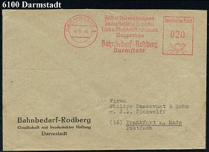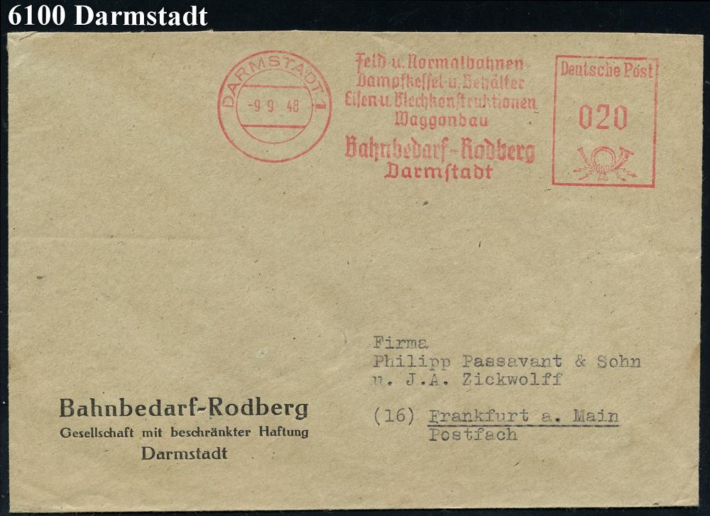 1162 | 14 € | 6100 Darmstadt Absender-Freistempel : DARMSTADT 1/ Feld-u.Normalbahnen/ Dampfkessel../ Waggonbau/ ..Rodberg 1949 (9.9.) AFS Francotyp "Posthorn" aiuf Firmen-Bf. (Dü.E-20CGo) | ![]() | |