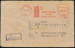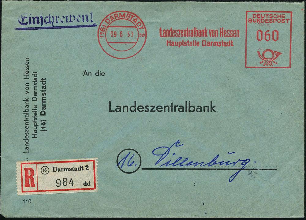 1164 | 15 € | 6100 Darmstadt Absender-Freistempel : (16) DARMSTADT 2/ Landeszentralbank v.Hessen/ Hauptstelle 1953 (9.6.) AFS Francotyp "Posthorn" 060 Pf. + RZ: (16) Darmstadt 2/d d, Inl.-R-Dienst-Bf. (Dü.E-23CG) | ![]() | |