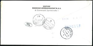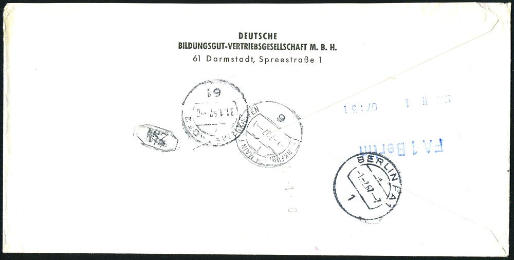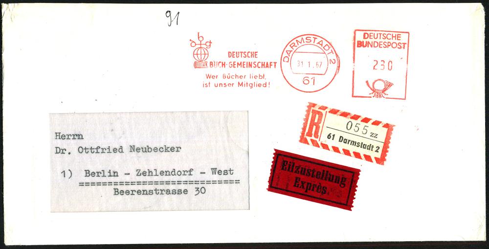 1171 | 20 € | 6100 Darmstadt Absender-Freistempel : 61 DARMSTADT 2/ dbg/ DEUTSCHE/ BUCH-GEMEINSCHAFT.. 1967 (31.1.) AFS Postalia 230 Pf. = 2. Gew.-Stufe (Globus- u. Buch-Logo) + Selbstbucher-RZ: 61 Darmstadt 2/z z, Inl.-Eil-R-Bf., n. West-Berlin (rs. div. Eil-AS), seltene Portostufe! (Dü.E-26 Po) | ![]() ![]() | |
