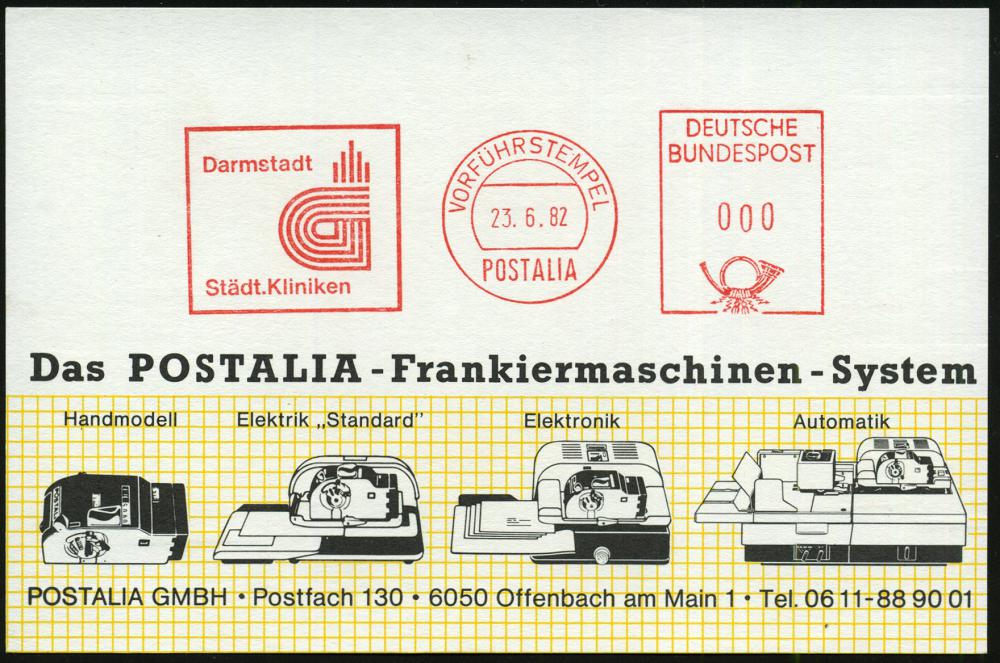 1174 | 18 € | 6100 Darmstadt Absender-Freistempel : Darmstadt 1982 (23.6.) AFS.: VORFÜHRSTEMPEL/POSTALIA/..Städt. Kliniken (Kommunal-Logo) seltene Postalia-Musterkt.! (= Specimen) | ![]() | |