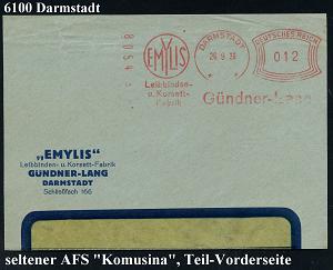 1140 | 18 € | 6100 Darmstadt Absender-Freistempel : DARMSTADT/ *1*/ EMYLIS/ Leibbinden-/ u.Korsett-Fabrik/ Gündner-Lang 1936 (26.9.) seltener AFS Komusina "Bogenrechteck" auf Firmen-Teil-Vorderseite (Dü.E-1 A, Nr.66) | ![]() | |