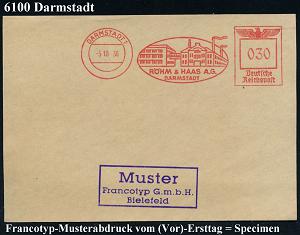 1141 | 35 € | 6100 Darmstadt Absender-Freistempel : DARMSTADT 1/ RÖHM & HAAS AG.. 1938 (5.10.) AFS-Musterabdruck Francotyp "Reichsadler" (Fabrik-Anlage = chemische Fabrik) glasklar gest. Francotyp-Musterblatt vom (Vor)-Ersttag!, selten! (Dü.E-5CGo) | ![]() ![]() | |