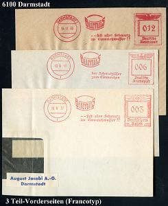 1142 | 28 € | 6100 Darmstadt Absender-Freistempel : DARMSTADT 1/ Burnus.. 1937/40 3 verschiedene AFS Francotyp "Hakenkreuz" bzw. "Reichsadler" (je Firmen-Logo: Waschtrog = Waschmittel-Produzent) 3 Teil-Vorderseiten, 3 Belege (Dü.E-3CEo, E-5CEo) | ![]() | |