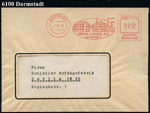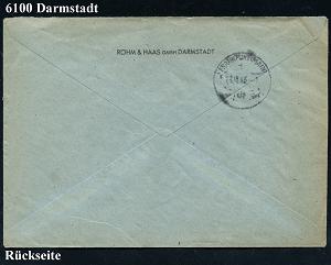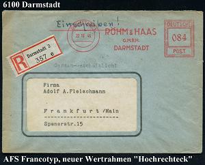 1161 | 28 € | 6100 Darmstadt Absender-Freistempel : DARMSTADT 1/ RÖHM & HAAS/ GMBH.. 1946 (22.10.) seltener AFS Francotyp "Hochrechteck" 084 Pf. + RZ: Darmstadt 2/e , rs. Abs.-Vordruck = chemische Firma, Erfinder des "Plexiglases" (vergl. Nr.1141 1145 u. 1152) Fern-R-Bf. (Dü.E-18CEo, nur ca. 1 1/2 Jahre verwendet) | ![]() ![]() | |
