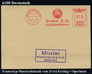 1147 | 35 € | 6100 Darmstadt Absender-Freistempel : DARMSTADT 2/ GAG/ Goebel AG/ Spezialmaschinen 1938 (11.4.) AFS-Musterabdruck Francotyp "Reichsadler" (Monogr.-Logo) glasklar gest. Francotyp-Musterblatt vom (Vor)-Ersttag!, selten! (Dü.E-5CGo) | ![]() ![]() | |