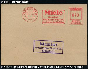 1148 | 35 € | 6100 Darmstadt Absender-Freistempel : DARMSTADT 2/ Miele/ Haushalt-/ Wäschezentrifugen/ erleichtern den Waschtag 1938 (22.7.) AFS-Musterabdruck Francotyp "Reichsadler" glasklar auf Francotyp-Musterblatt vom (Vor)-Ersttag!, selten! (Dü.E-5CGo) | ![]() ![]() | |