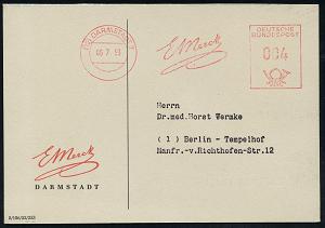 1158 | 25 € | 6100 Darmstadt Absender-Freistempel : DARMSTADT/ 1/ 40 Jahre/ elektr.Kleinmotoren/ u,Ventilatoren/ Hessenwerk 1946 (7.8.) aptierter AFS Francotyp "Reichsadler" = entfernt + "Reichs" = Notmaßnahme! , Firmen-Bf.: HESSENWERKE.., vergl. Nr. 1155 (Dü.E-13 Y-127h) | ![]() | |