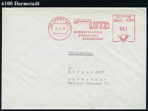 1170 | 6 € | 6100 Darmstadt Absender-Freistempel : (16) DARMSTADT 1/ Leonhard LUTZOHG/ BÜROMASCHINEN/ BÜROMÖBEL.. 1957 (5.4.) AFS Postalia auf Orts-Bf. (Dü.E-23 B) | ![]() | |