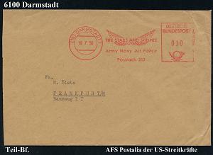 1169 | 15 € | 6100 Darmstadt Absender-Freistempel : (16) DARMSTADT 1/ THE STARS AND STRIPES/ Army Navy Air Force 1956 (18.7.) seltener AFS Postalia der US-Streitkäfte (2 US-Flaggen) = US.-Truppen-Zeitung, Teil-Bf. mit voller Anschrift (Dü.E-23 B) | ![]() | |