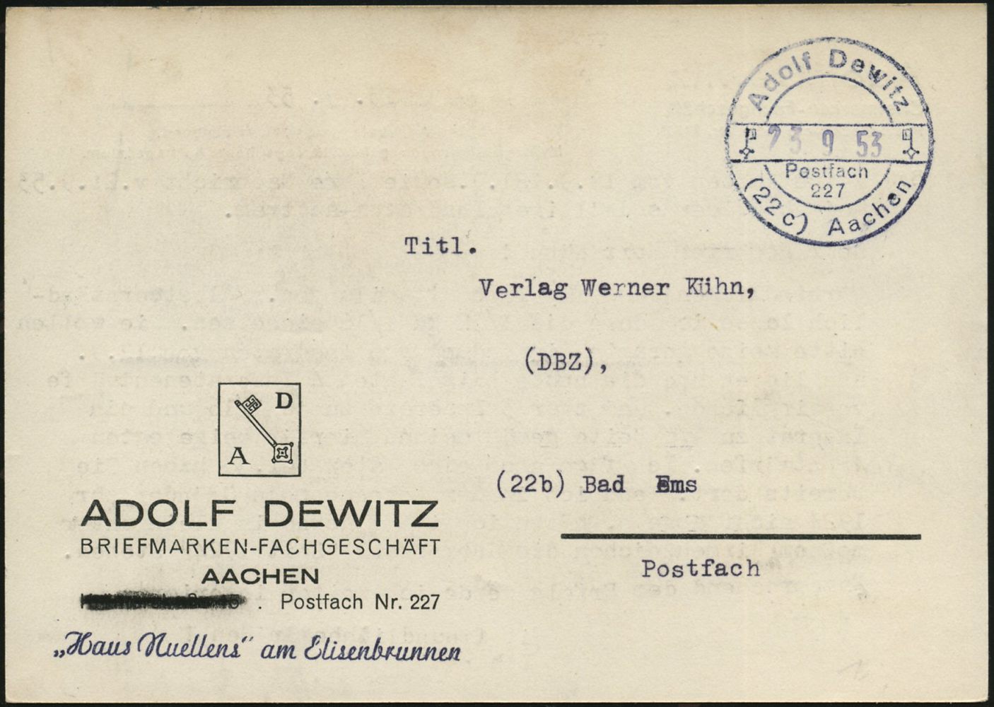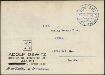 9524 | 18 € | 5100 AACHEN (Allgem. Abteilung, Tagesstempel, Ganzsachen etc.) : (22c) Aachen/ Adolf Dewitz/ Postfach/ 227 1953 (23.9.) viol., private 1K-Brücke ähnl. einem Gebühr-Bezahlt-Stempel (2 Schlüssel) unbeanstandet auf Firmenkt. n.Bad Ems, kurioser Beleg! | ![]() | |