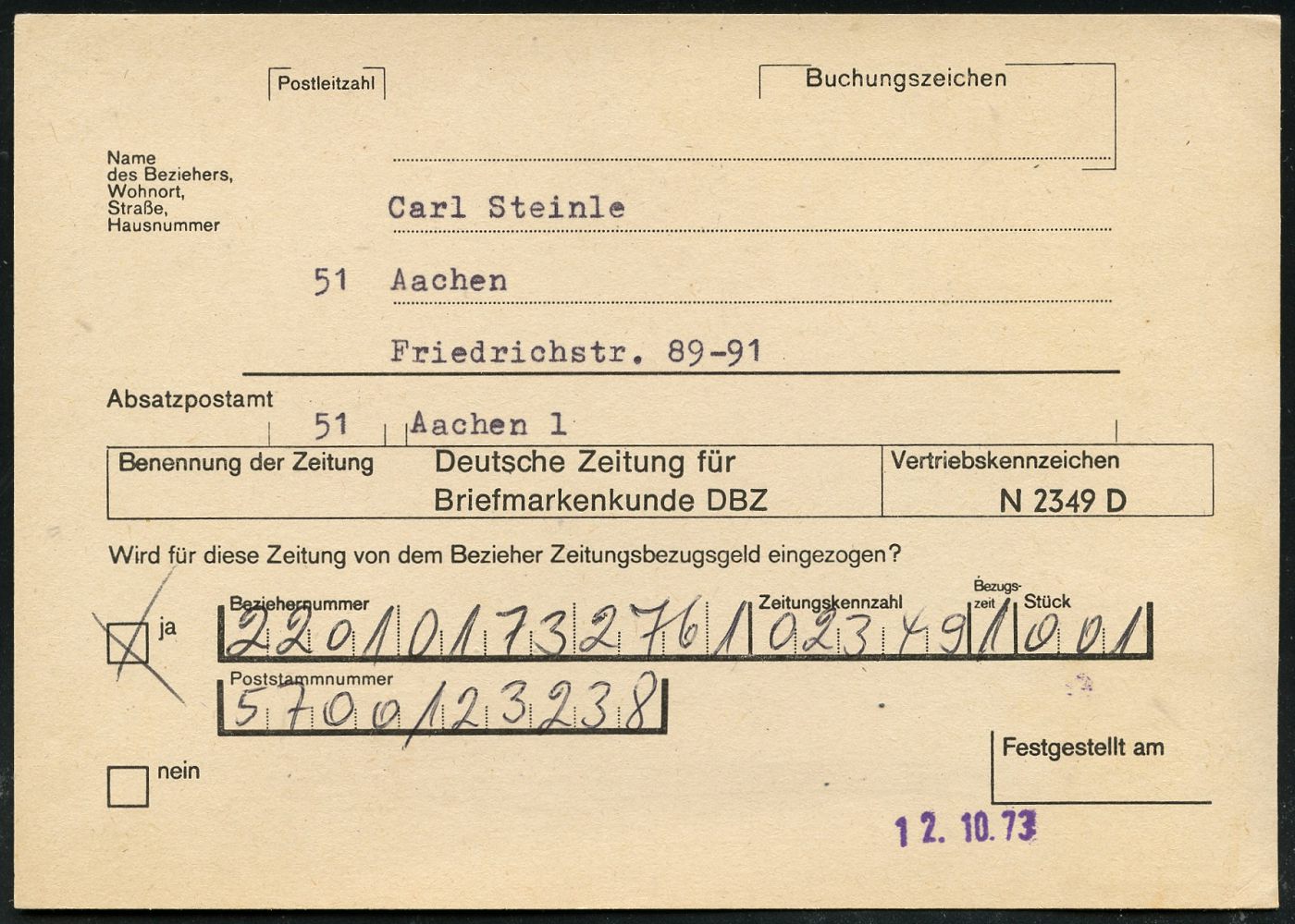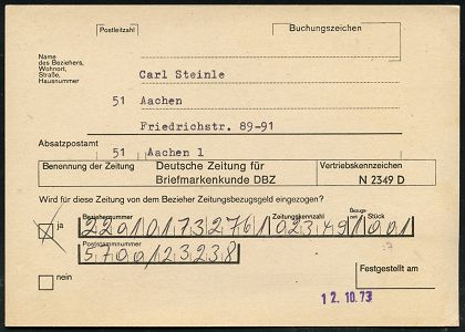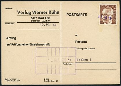 9525 | 22 € | 5100 AACHEN (Allgem. Abteilung, Tagesstempel, Ganzsachen etc.) : Aachen 1 1973 (12.10.) viol. Datums-1L vom PA Aachen 1 = nachträgliche Entwertung auf EF 10 Pf. Heinemann, seltene, niedrige Portostufe "Sammel-Einzieh-Anschriftenprüfung" (+ Info), sehr selten! (Mi.636/EF) | ![]() ![]() ![]() | |