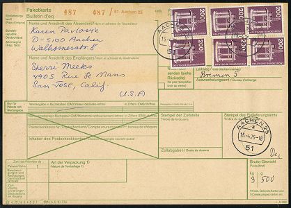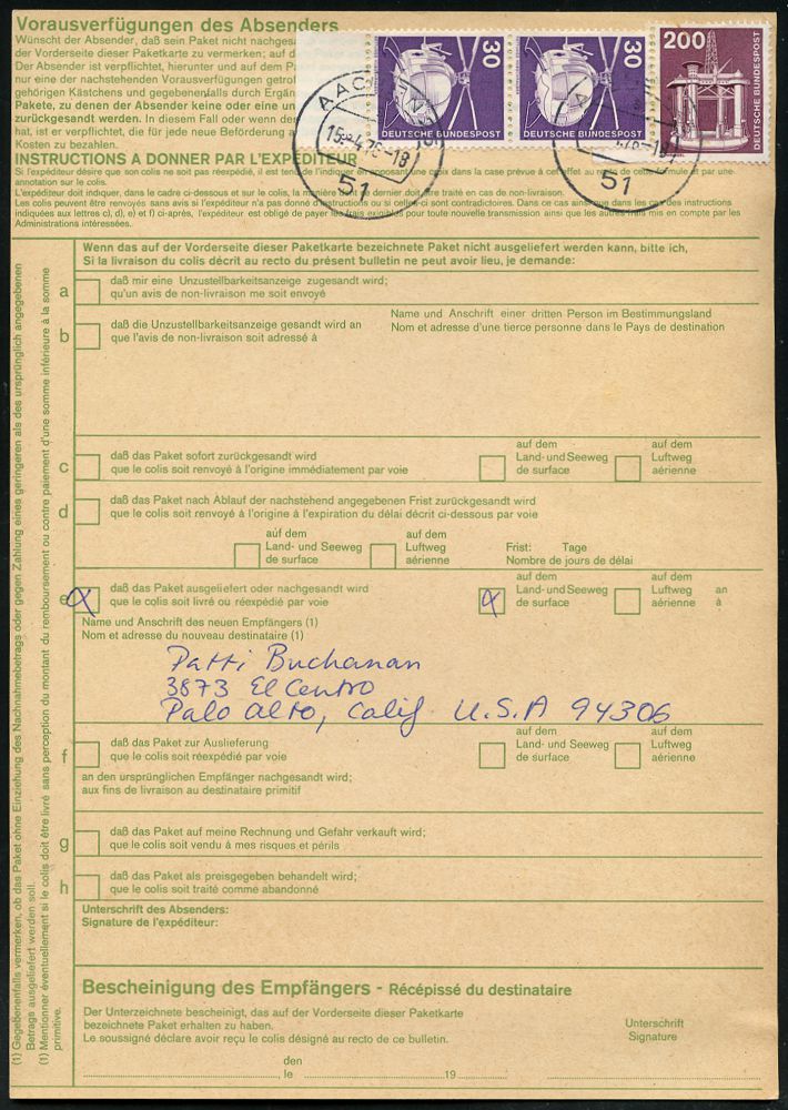 9528 | 18 € | 5100 AACHEN (Allgem. Abteilung, Tagesstempel, Ganzsachen etc.) : 51 AACHEN 25/ a 1976 1K-Segment auf 6x 200 Pf. Technik (Ölbohrinsel) u. weitere 260 Pf. rs. + brauner Paketzettel: 51 Aachen 25 = Bildchen = PSt.I, 1460 Pf.-Frankatur, klar gest. Übersee-Paketkt. n. U.S.A. | ![]() ![]() | |