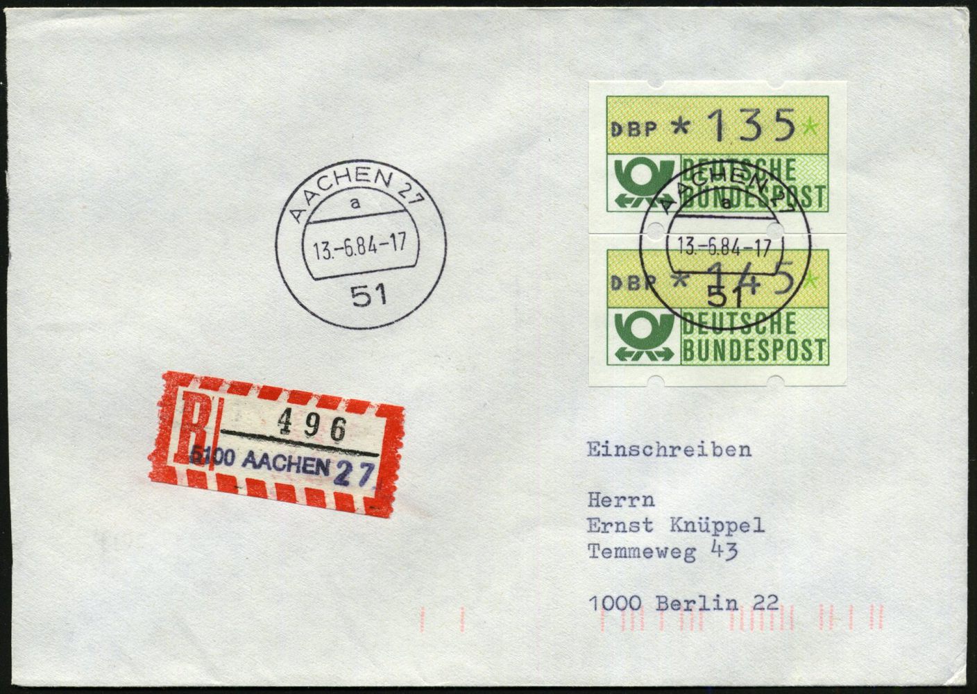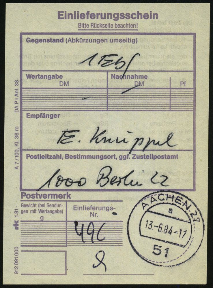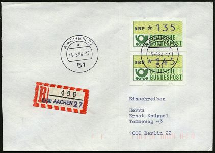 9529 | 20 € | 5100 AACHEN (Allgem. Abteilung, Tagesstempel, Ganzsachen etc.) : 51 AACHEN 27/ a 1984 (13.6.) 1K-Segment + provis. RZ: 5100 Aachen 27 (schw.viol. 1L aus Setzkasten, 2 Zifferntypen!) = PSt.I VaalserquartierI, ATM-Frankatur 135 + 145 Pf., klar gest. Fern-R-Bf. + R-Einl.-Schein, 2 Belege kompl.! | ![]() ![]() | |