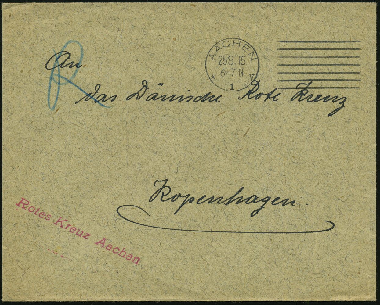 9517 | 20 € | 5100 AACHEN (Allgem. Abteilung, Tagesstempel, Ganzsachen etc.) : AACHEN/ *1v 1915 (25.8.) Maschinen-StrichSt. (7 Striche rechts) + roter 1L: Rotes Kreuz Aachen , portofreier Ausl.-Bf. an das Dänischer Rote Kreuz, Kopenhagen (rs. AS), ohne Zensur! | ![]() ![]() | |