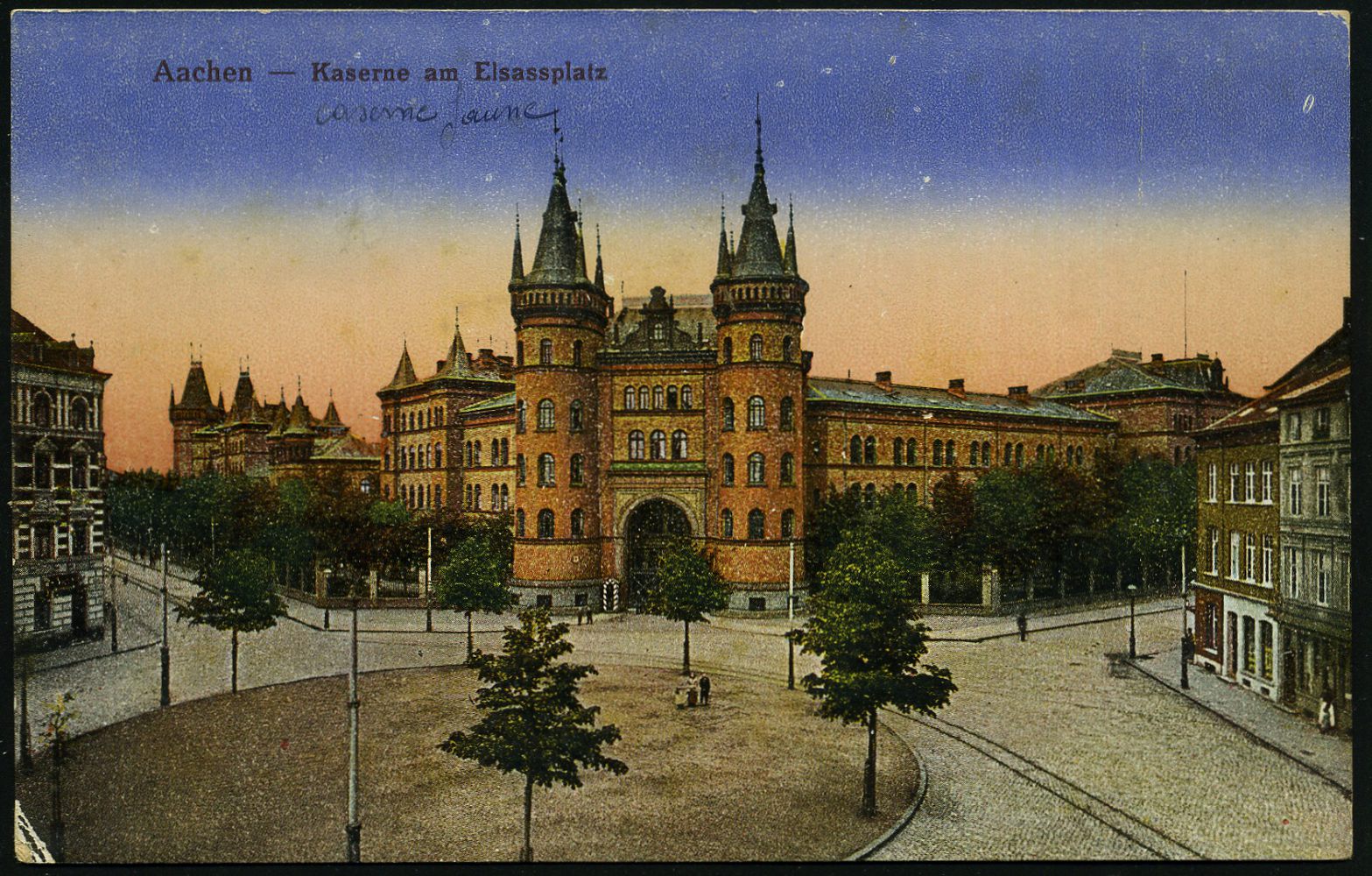 9518 | 10 € | 5100 AACHEN (Allgem. Abteilung, Tagesstempel, Ganzsachen etc.) : Aachen 1919 (ca.) Color-Foto-Ak.: Kaserne am Elsassplatz + hs. Zusatz "Caserne Jaune" (= Gelbe Kaserne) aus der Zeit der Rheinland-Besetzung (kl. Eckfehler) ungebr. (Uhv.: WIZICO) | ![]() | |