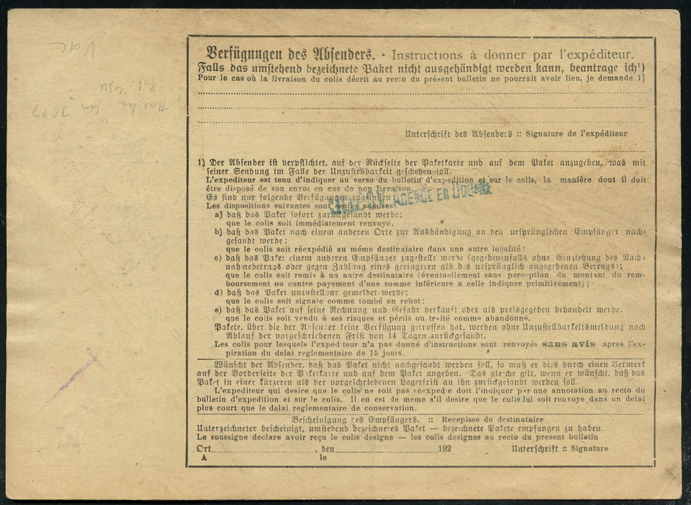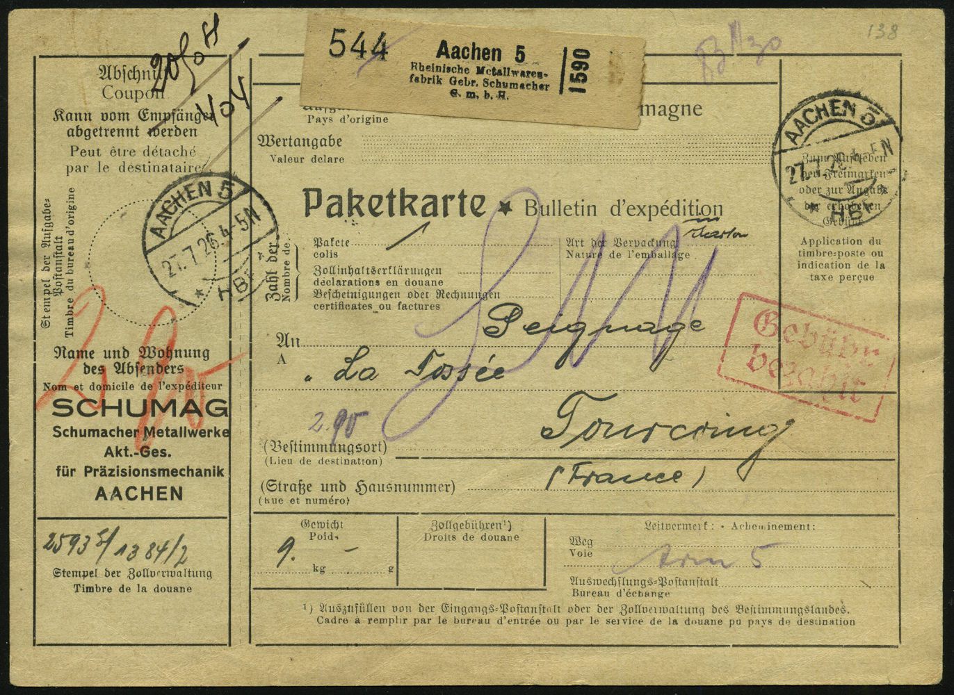 9520 | 25 € | 5100 AACHEN (Allgem. Abteilung, Tagesstempel, Ganzsachen etc.) : AACHEN 5/ * HBF * 1926 (27.7.) 1K-Brücke + roter Ra.2: Gebühr/bezahlt + Selbstbucher-Paketzettel: Aachen 5/ Rheinische Metallwaren- fabrik Gebr. Schumacher/G.m.b.H., klar gest. Ausl.-Selbstbucher-Paketkt.: SCHUMAG Schumacher-Metallwerke AG.. n. Frankreich (rs. blauer Zoll-1L.) | ![]() ![]() | |
