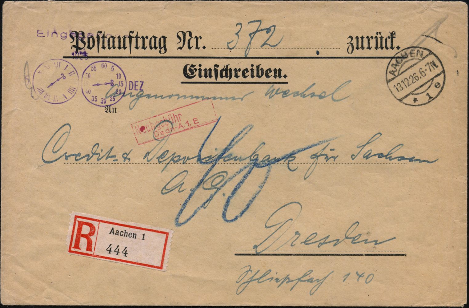 9521 | 28 € | 5100 AACHEN (Allgem. Abteilung, Tagesstempel, Ganzsachen etc.) : AACHEN/ *1e 1926 (13.12.) 1K-Brücke + RZ: Aachen 1 + roter Ra.2: Nachgebühr/Dsdn-A. 1. E ("40" Pf.) Fern-Postauftrags-Nachporto-R-Bf.! (viol. Minuten-AS: Sächs.Depositen-Bank) n. Dresden, selten! | ![]() | |