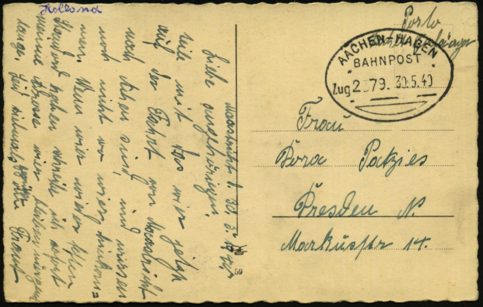 9523 | 20 € | 5100 AACHEN (Allgem. Abteilung, Tagesstempel, Ganzsachen etc.) : AACHEN-HAGEN/ BAHNPOST/ Zug 2379 1940 (30.5.) Bahn-Oval + hs. Zusatz "Porto zahlt empfänger" auf Feldpost-Ak. aus Maastricht = Überfall auf Niederlande Anfang Mai 1940 (Bruch der Neutralität, Feldzug vom 10.-15.Mai) auf Rücktransport n. Dresden | ![]() ![]() | |