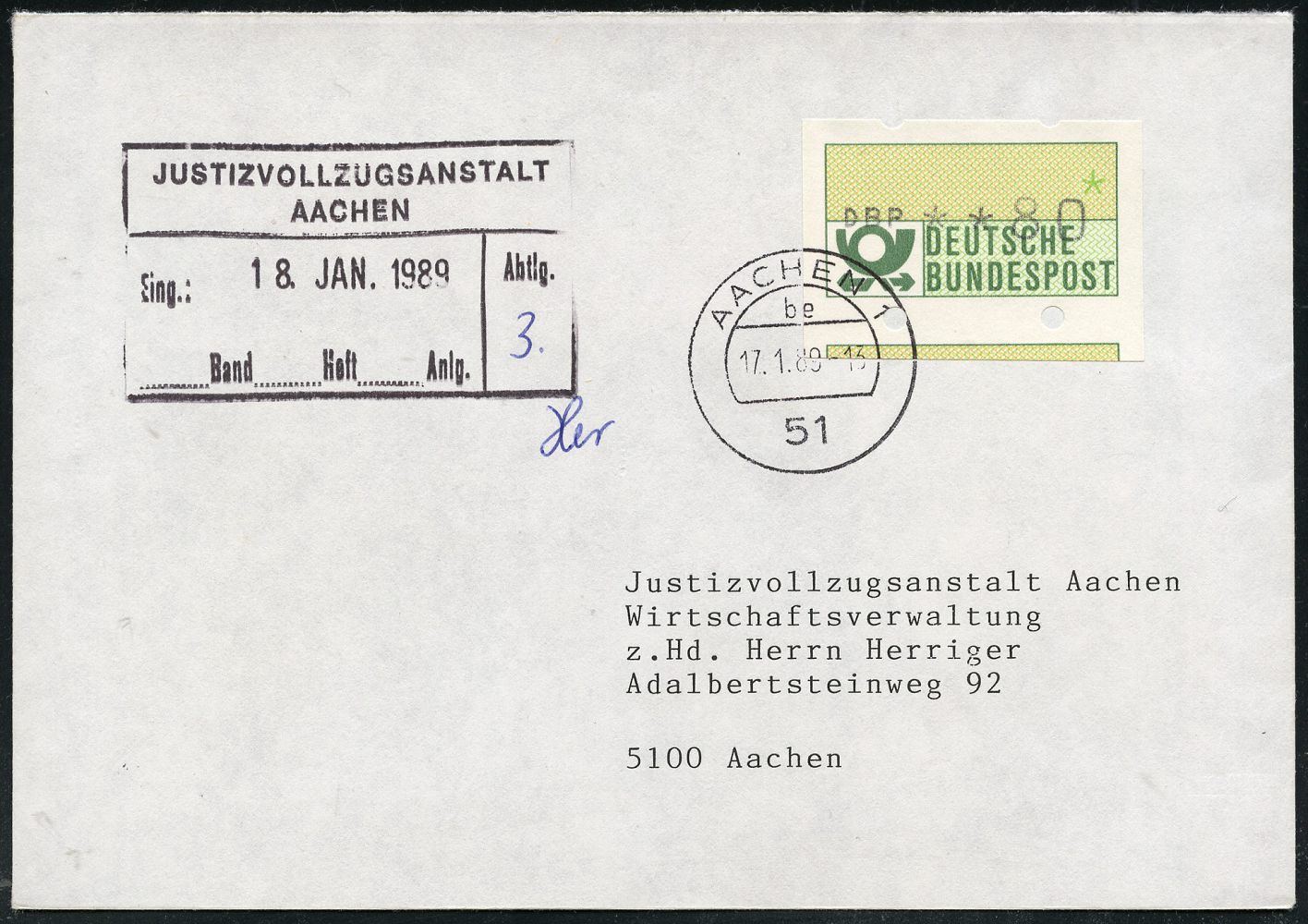 9530 | 18 € | 5100 AACHEN (Allgem. Abteilung, Tagesstempel, Ganzsachen etc.) : 51 AACHEN 1/ be 1989 (17.1.) 1K-Segment auf EF 80 Pf. ATM, Verschnitt-Abart, daher Über-Format! , Bedarfs-Ortsbf. an die Justizvollzugsanstalt mit Eingangsstempel ! (Mi.1) | ![]() | |