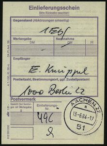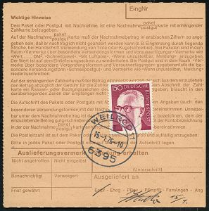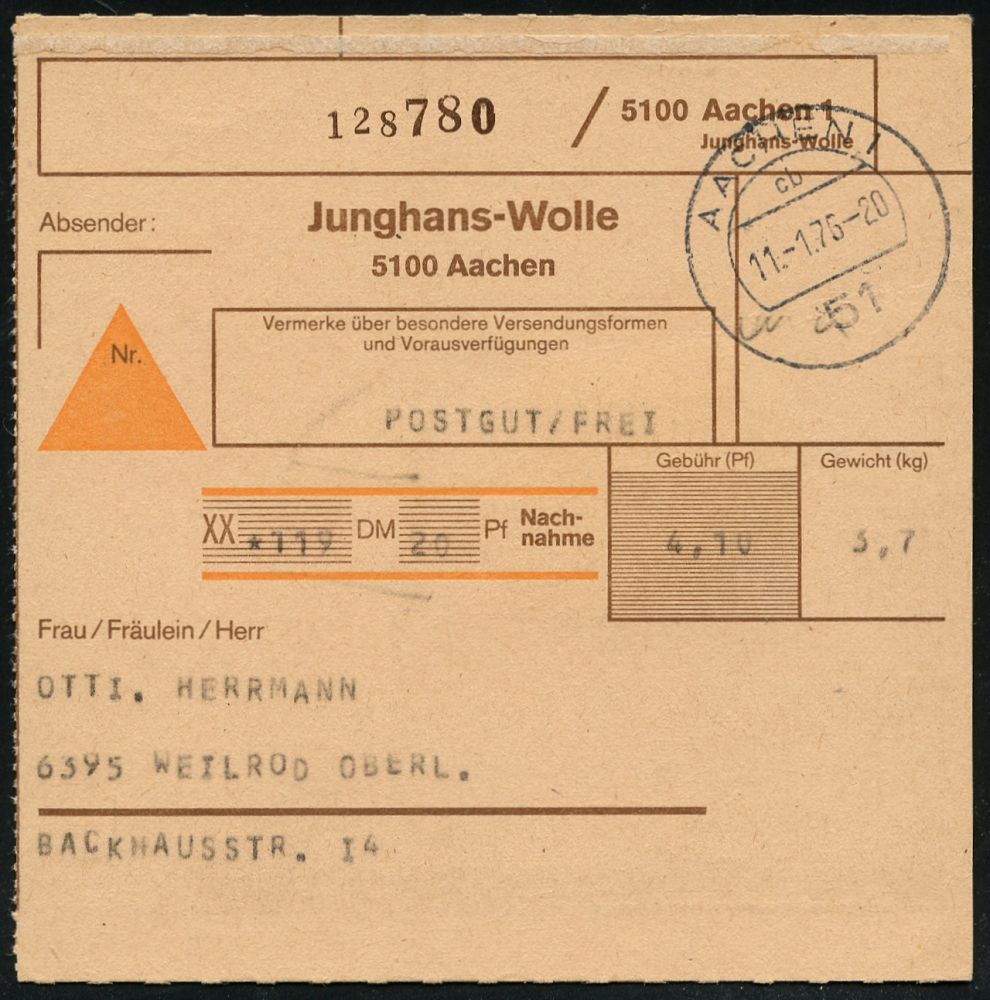 9527 | 15 € | 5100 AACHEN (Allgem. Abteilung, Tagesstempel, Ganzsachen etc.) : 51 AACHEN 1/ cb 1976 (11.1.) 1K-Segment auf Selbstbucher-NN-Paketkarte mit EDV-Adressierung "POSTGUT/FREI "+ Gebühr 4,10 (Pf.) 5100 Aachen 1/ Junghans Wolle n. Weilrod, rs. AS. auf 150 Pf. Heinemann Gebühr! | ![]() ![]() | |