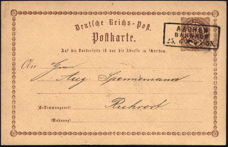 9513 | 18 € | 5100 AACHEN (Allgem. Abteilung, Tagesstempel, Ganzsachen etc.) : AACHEN/ BAHNHOF/ * 1873 (25.6.) nachverwendeter preuss. Ra.3 (Feuser Nr.004) klar auf Inl.-P 1/2 Gr. (Mi.P 1) | ![]() | |