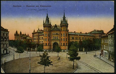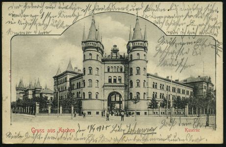 9514 | 12 € | 5100 AACHEN (Allgem. Abteilung, Tagesstempel, Ganzsachen etc.) : Aachen 1905 (25.7.) s/w.-Foto-Ak.: Gruss aus Aachen Kaserne = Kaserne am Elsassplatz , 1K-Brücke: AACHEN/* 1 a, Bedarf | ![]() ![]() | |