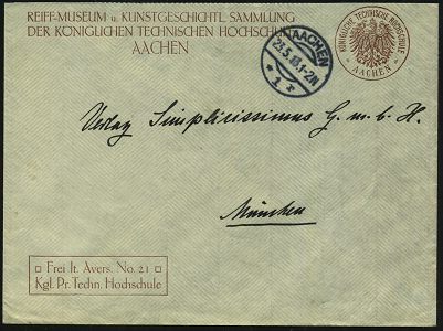 9515 | 20 € | 5100 AACHEN (Allgem. Abteilung, Tagesstempel, Ganzsachen etc.) : AACHEN/ *1r 1913 (23.5.) 1K-Brücke auf markenlosem Dienst-Bf.: Frei lt. Avers No.21/ Kgl. Pr. Techn. Hochschule + REIFF-MUSEUM u. KUNST-GESCHICHTL. SAMMLUNG/ DER KÖNIGL. TECHNISCHEN HOCHSCHULE an Simplicissimus-Verlag, München!, seltener Beleg! | ![]() | |